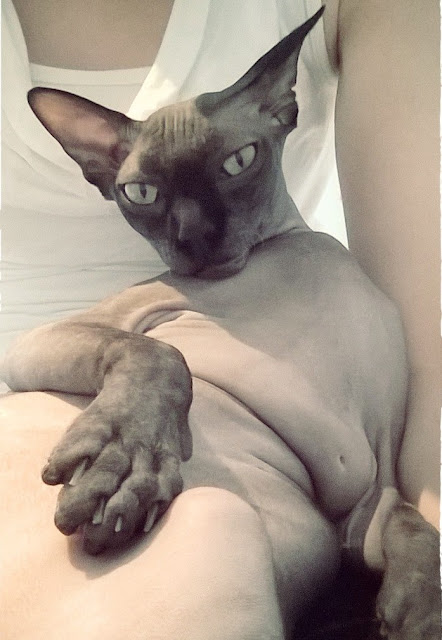 Meidän oma vähän erilainen kisu antoi ottaa itsestään tänään oikein edustavia kuvia. Kannattaiskohan aloittaa kuntokuuri. Kuvien perusteella kaverille on kertynyt turhan paljon lihakerrosta ja kunnon manboobsit. No, tarkennettakoon, että kuvakulma ei ole se mitä edustavin. :D